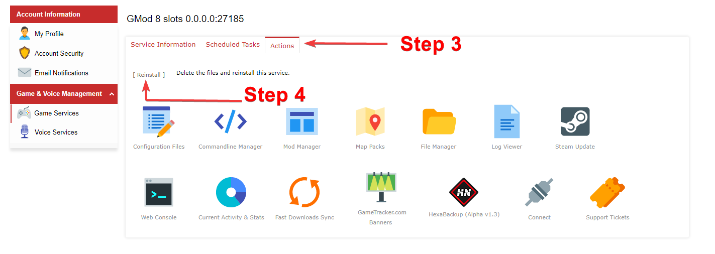 - Navigate to Game Services (If you have multiple servers, select the one you wish to re-install)